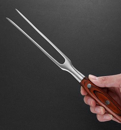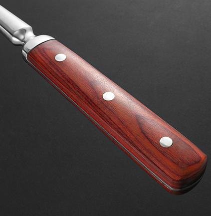 The comfortable handle is smooth and thorn-free, rounded, comfortable, and easy to clean. The slender two-tined fork is sharp and sharp. The blade is finely ground and hand-sharpened. Material: Handle rosewood + 402 stainless steel